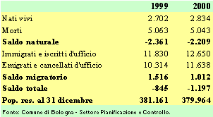 Tav. 2 - Movimento della popolazione residente nel comune di Bologna negli anni 1999 e 2000.